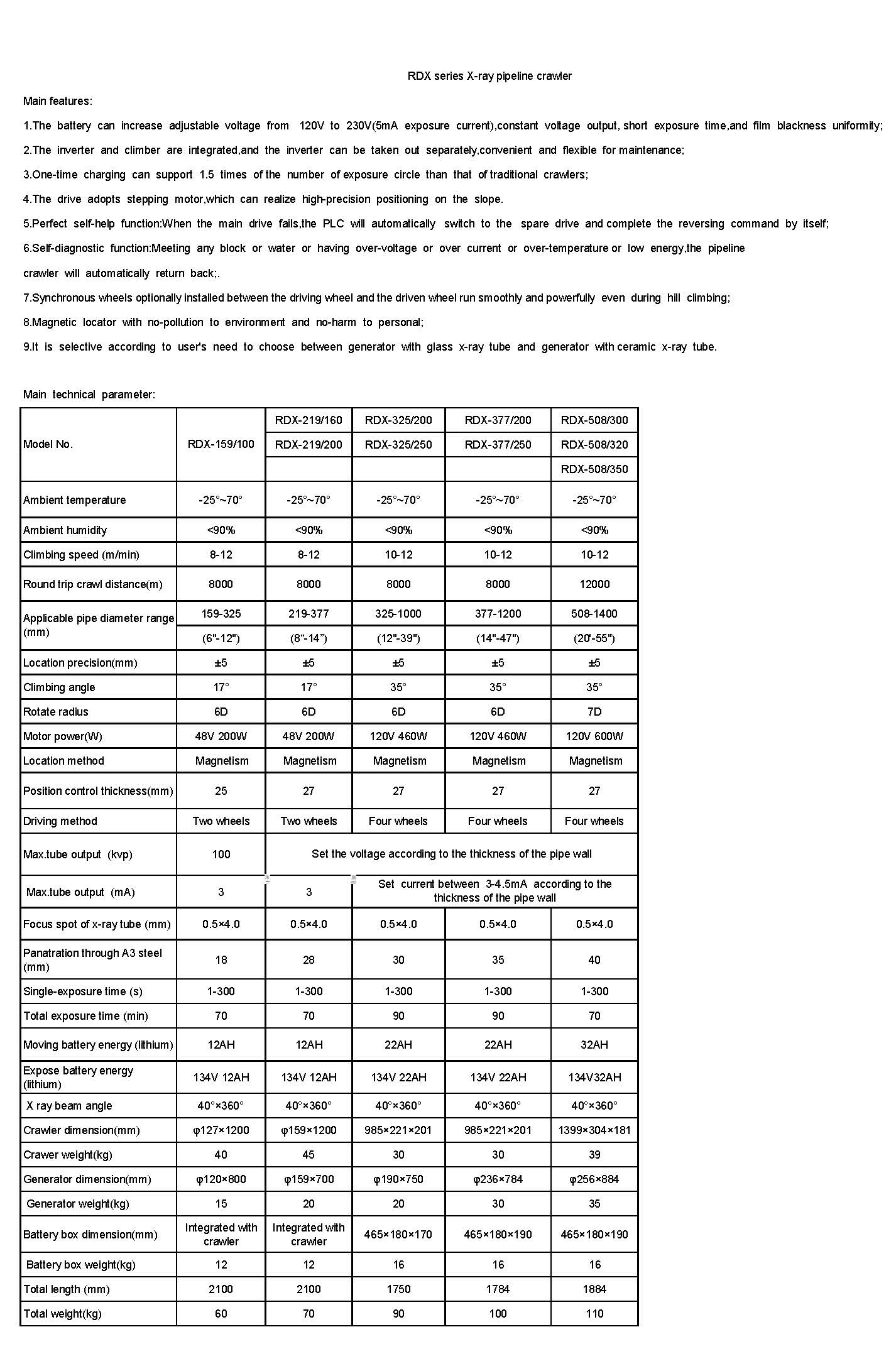 RDX series X-ray pipeline crawlers: 100kv-350kv, 159mm-1400mm,6”-55”.